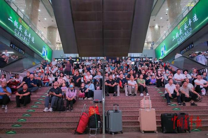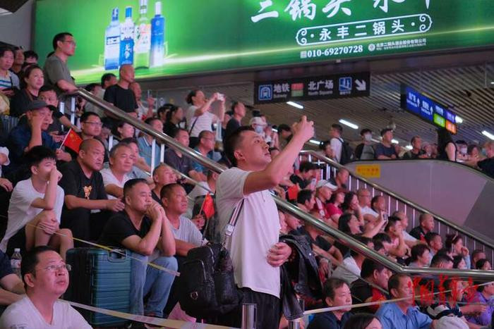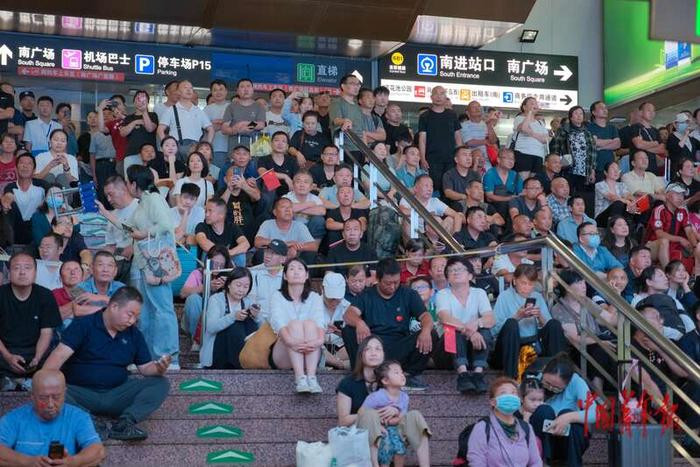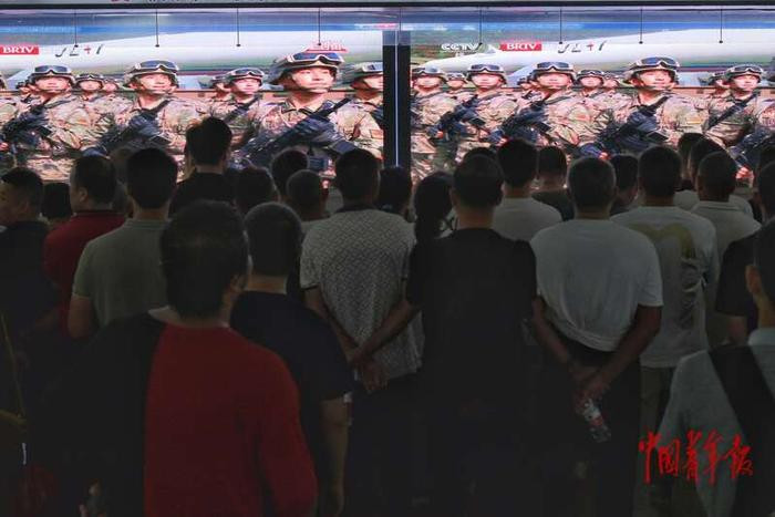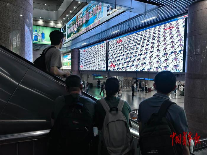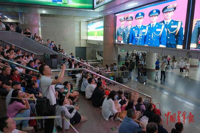 民众在北京西站观看阅兵直播